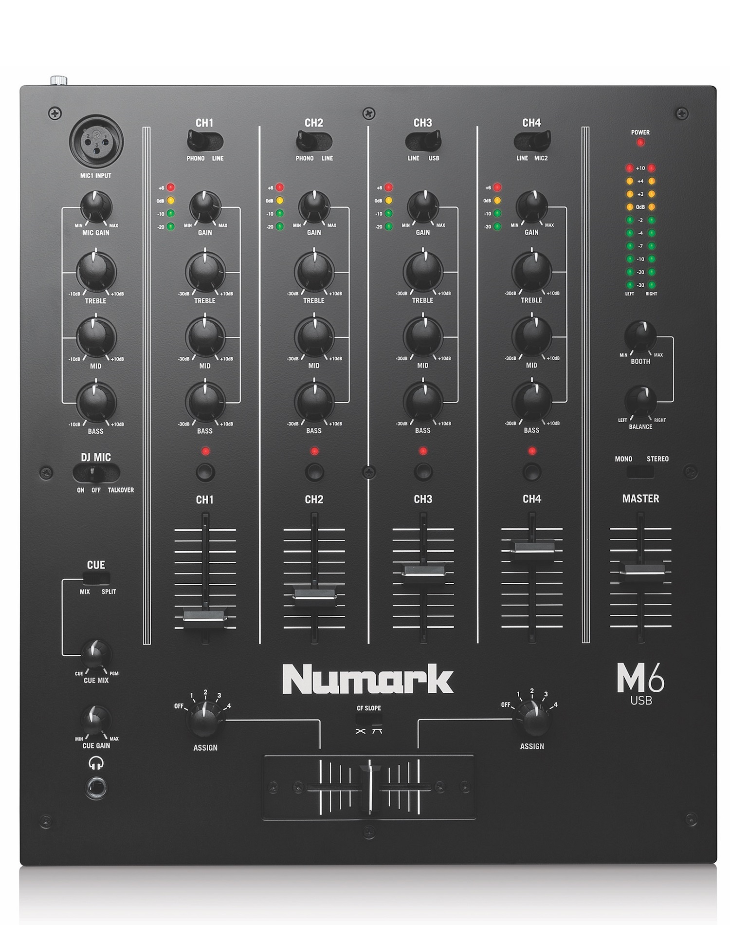 Numark M6 USB - это новый четырёхканальный DJ USB микшер от компании Numark. Numark M6 USB с клубным дизайном имеет компьютерное подключение по USB. При подключении Plug-and-Play к диджейскому Mac или PC компьютеру, диджей имеет возможность микшировать звук, идущий с аудиоплейера (программы воспроизведения) и записывать свое выступление в приложении аудиозаписи. Numark M6 USB имеет: трёхполосный эквалайзер и LED-индикатор на канал, переключаемый, присваиваемый кроссфейдер с управлением переходом и сбалансированными выводами. Плюс к этому Numark M6 USB имеет выделенный канал микрофона XLR и ещё один микрофонный вход на четвертом канале.