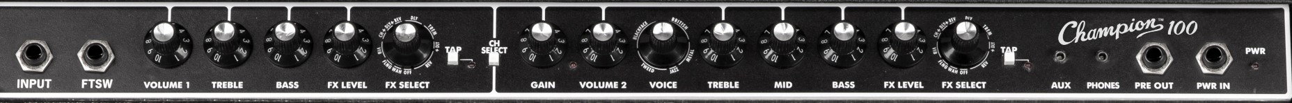 • Каналы – два: первый Volume и Treble, Bass и FX Level, FX Select и TAP, второй Gain, Volume с Voice Master Treble, Bass, FX Level, FX Select и TAP.