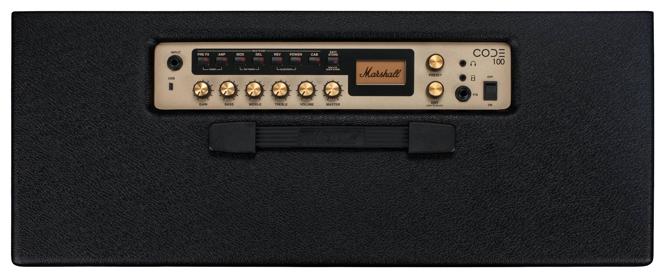 MARSHALL CODE 100 - полностью программируемый моделирующий цифровой гитарный комбоусилитель мощностью 100 Вт из линейки Code от знаменитого, не нуждающегося в представлении британского производителя. Модель сочетает в себе классическое и современное звучание Marshall, она оснащена широким набором эффектов профессионального качества. Всего доступно 100 пресетов. Эмуляторы моделей преампов и усилителей мощности, используемые CODE 100, были разработаны в сотрудничестве с Softube, была создана уникальная система моделирования Marshall-Softube (MST), которая с высокой точностью воспроизводит звучание различных усилителей Marshall. Усилитель имитирует звучание 14 преампов (JTM45 2245, 1962 Bluesbreaker, 1959SLP Plexi, JCM800 2203, JCM2555 Silver Jubilee, JCM2000 DSL100, JVM410H и другие), 4 усилителей мощности (лампы EL34, 5881, EL84 и 6L6) и 8 кабинетов (1960, 1960V, 1960AX, 1960HW, 1936, 1936V, 1912 и 1974X). Набор из 24 эффектов включает компрессор, классические гитарные педали дисторшн, вау-вау, питч шифтер, фазер, задержки, тремоло, реверберацию студийного качества и другие. Современные возможности модели включают подключение по Bluetooth, проигрывание музыки с MP3 плеера или непосредственно с мобильных устройств при помощи приложения GatewayTM, а также USB подключение к компьютеру. Комбоусилитель оснащен двумя высококачественными 12-дюймовыми динамиками. В комплекте поставляется футсвитч PEDL-91010. Вес модели – 24 кг.