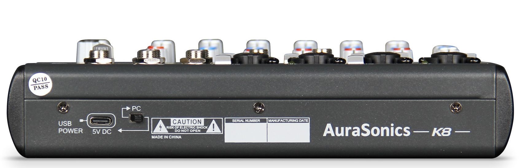 Микшеры К4 и К8 используют для питания стандартный сетевой адаптер 5В через кабель USB-A - USB-C. Также возможно питание микшера от USB- разъёма компьютера, при этом переключатель на задней панели определяет что микшер получает только питание DC или работает как аудио-интерфейс PC.