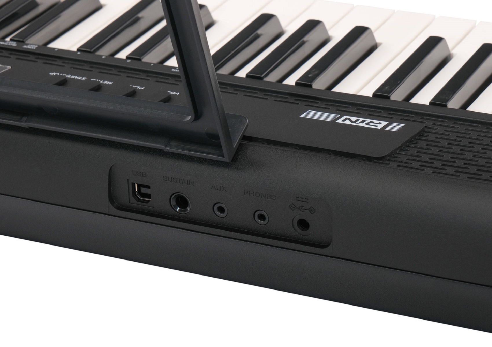 Разъемы подключения внешних устройств: вход питания 9 В постоянного тока, выход подключения наушников, вход AUX, гнездо подключения педали сустейна, USB MIDI.