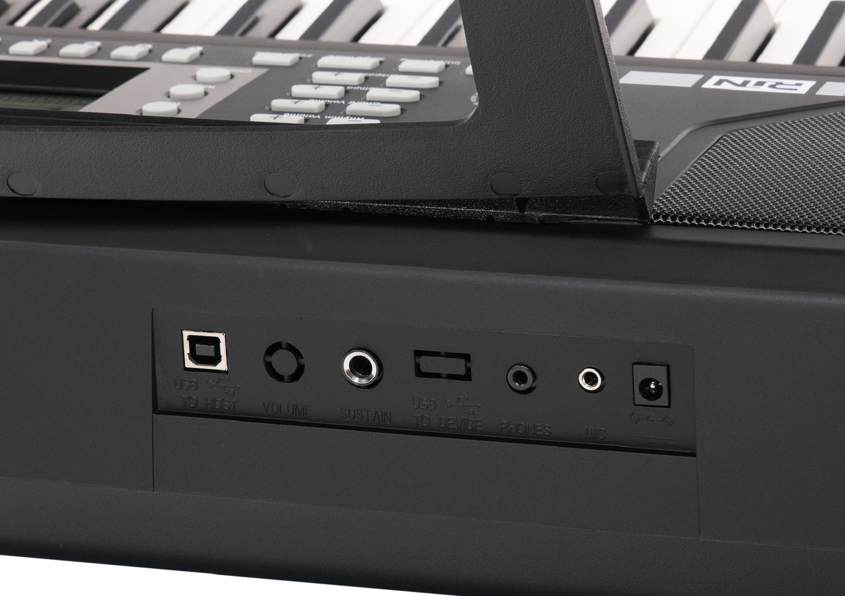 Разъемы подключения внешних устройств: вход питания 9 В постоянного тока, вход подключения микрофона, выход подключения наушников, гнездо подключения педали сустейн, разъем USB MIDI.