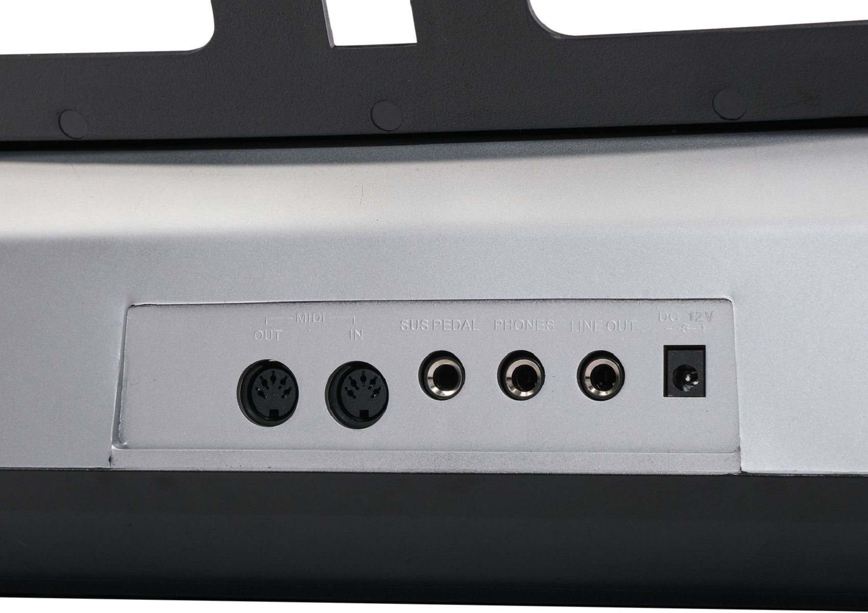 Подключения: разъем питания, разъем подключения наушников, разъем линейного выхода, разъем подключения педали сустейна, входной/выходной разъем MIDI.