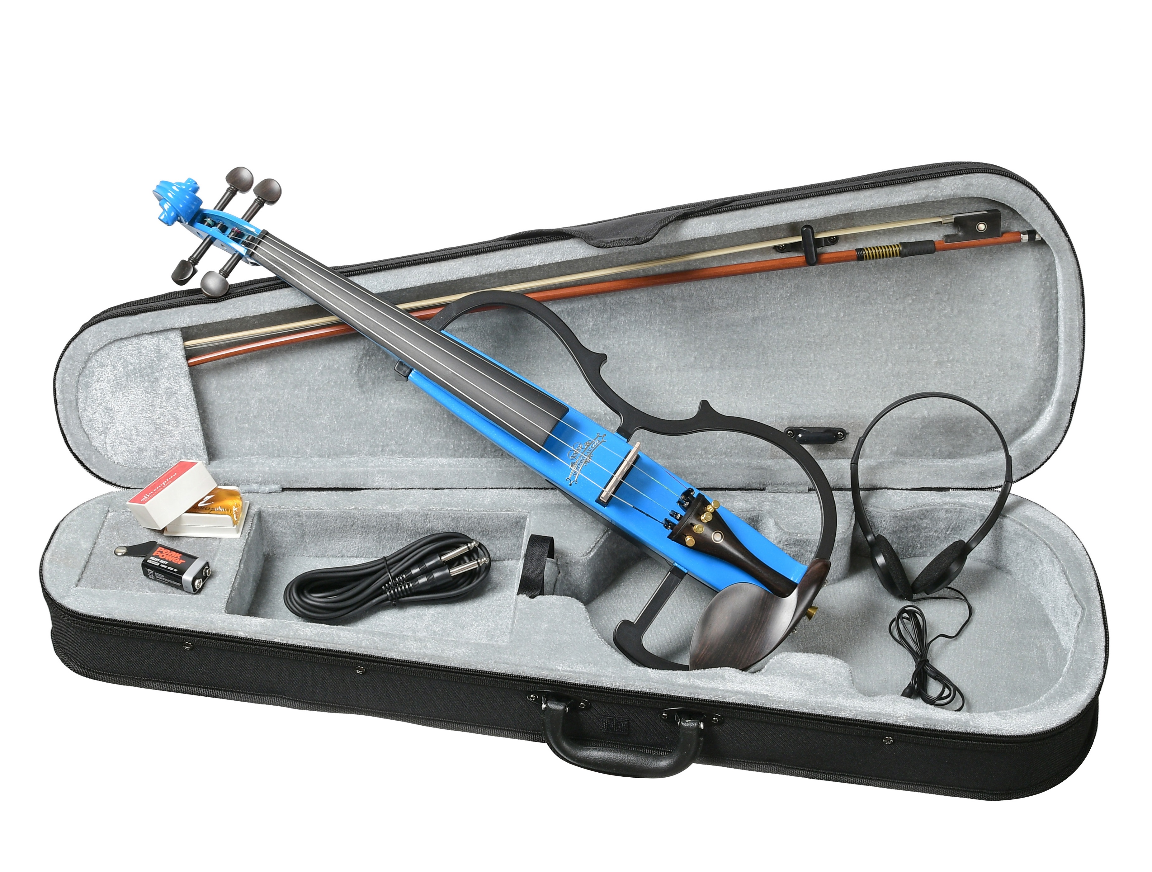 в комплект входит: скрипка + смычок + кейс + канифоль + наушники, батарейка тип крона, шнур