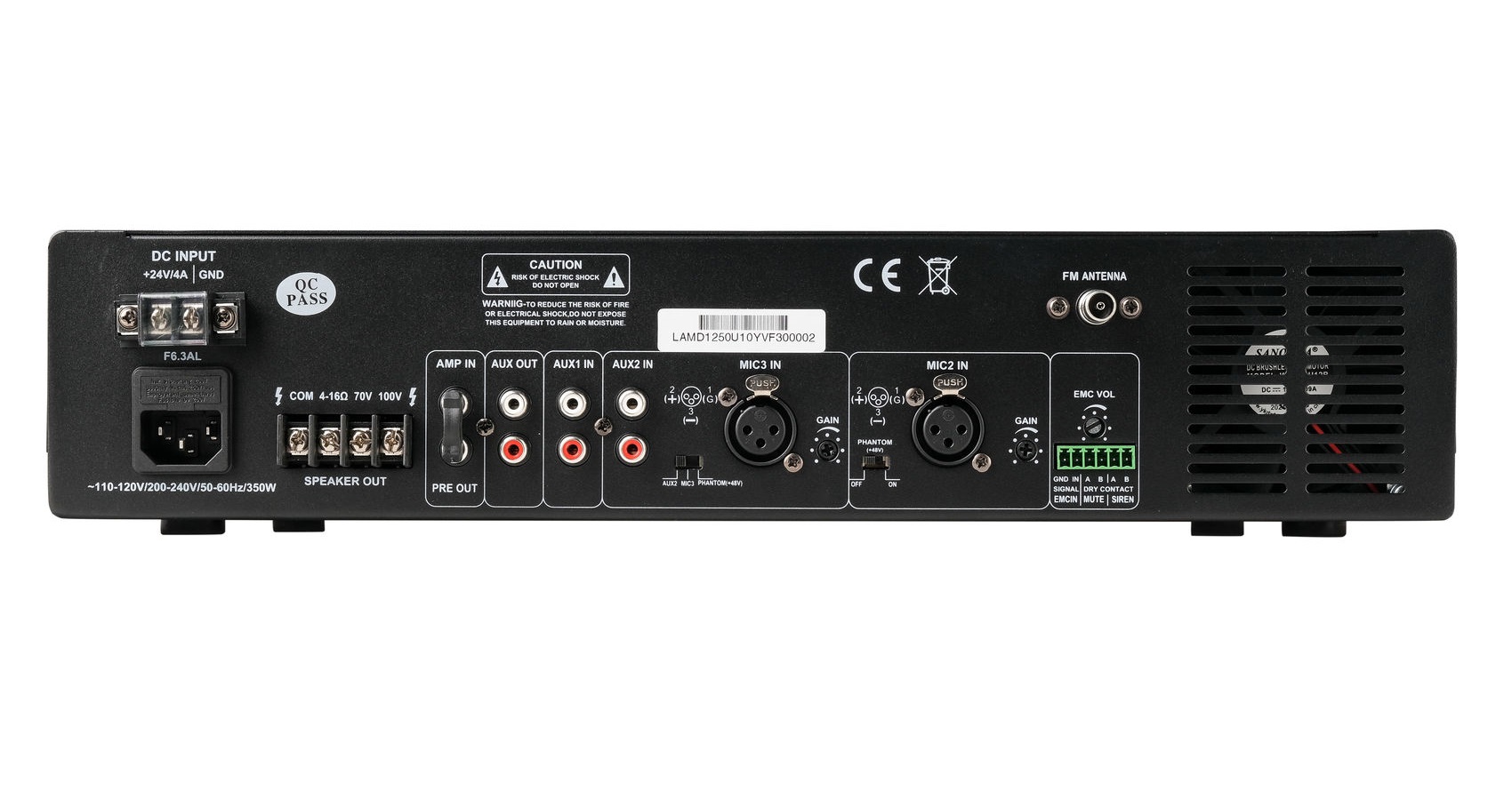 Аварийный вход, 3 микрофонных входа, 2 входа AUX, 1 выход AUX.