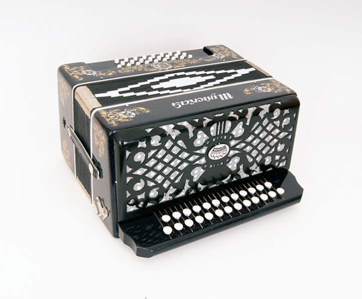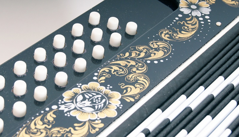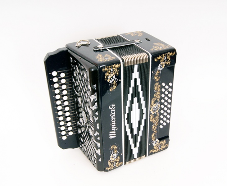 Трехголосая гармонь с регистром, звукоряд основан на неполной хроматической гамме.