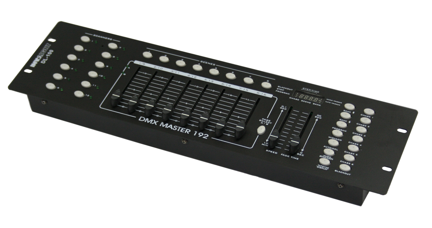 Управление: восемь фейдеров, LED дисплей, фейдер "time control", "BLACKOUT", MIDI