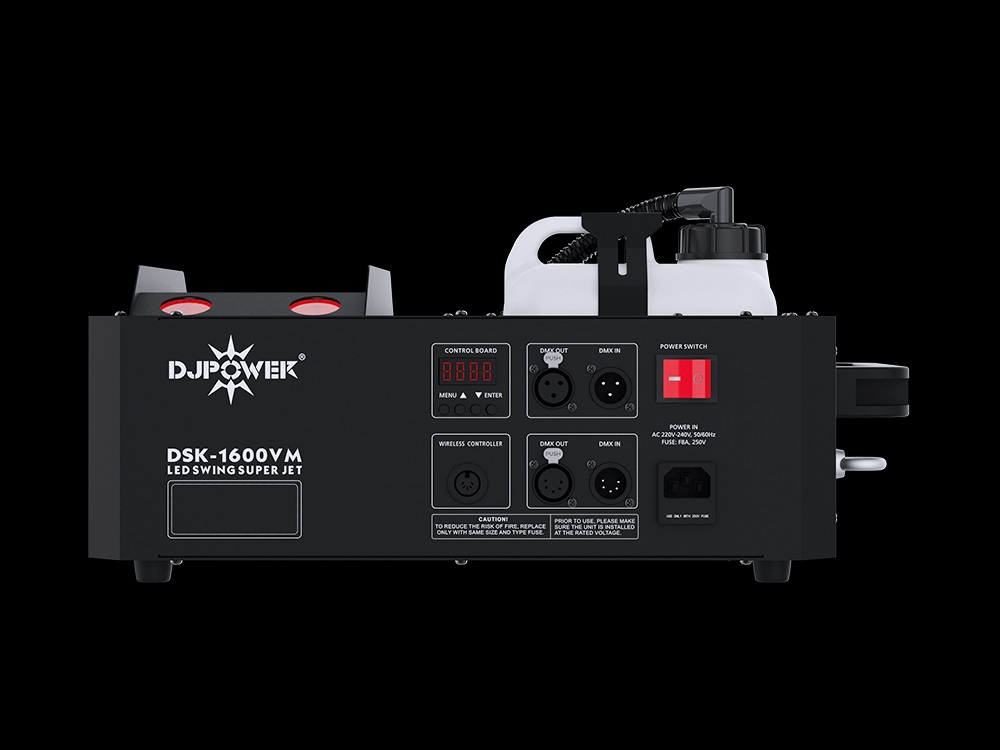 Новая версия дым-машины, независимо разработанная DJ Power, с углом горизонтального вращения 90°. Она оснащена восемью светодиодными лампами RGBAUV "пять в одном" мощностью 10 Вт, которые могут менять цвет струи. Благодаря новейшей технологии защиты от разбрызгивания "Anti-Squirting Plus" DSK-1600VM отличается повышенной безопасностью, независимо от того, подвешена ли она или находится на полу. Высота струи около 7-8 метров. Запатентованная технология DJ Power (патент No ZL201320700998.7) используется для обеспечения лучших эффектов. Отлично подходит для баров, концертных площадок, презентаций и других мест.