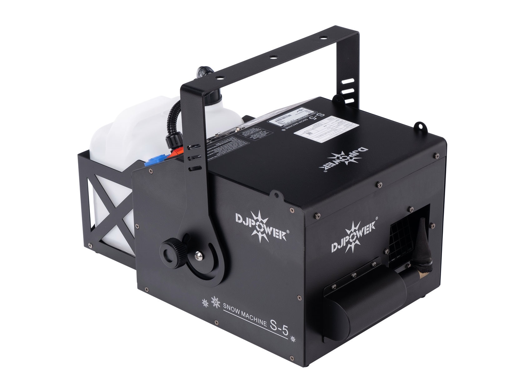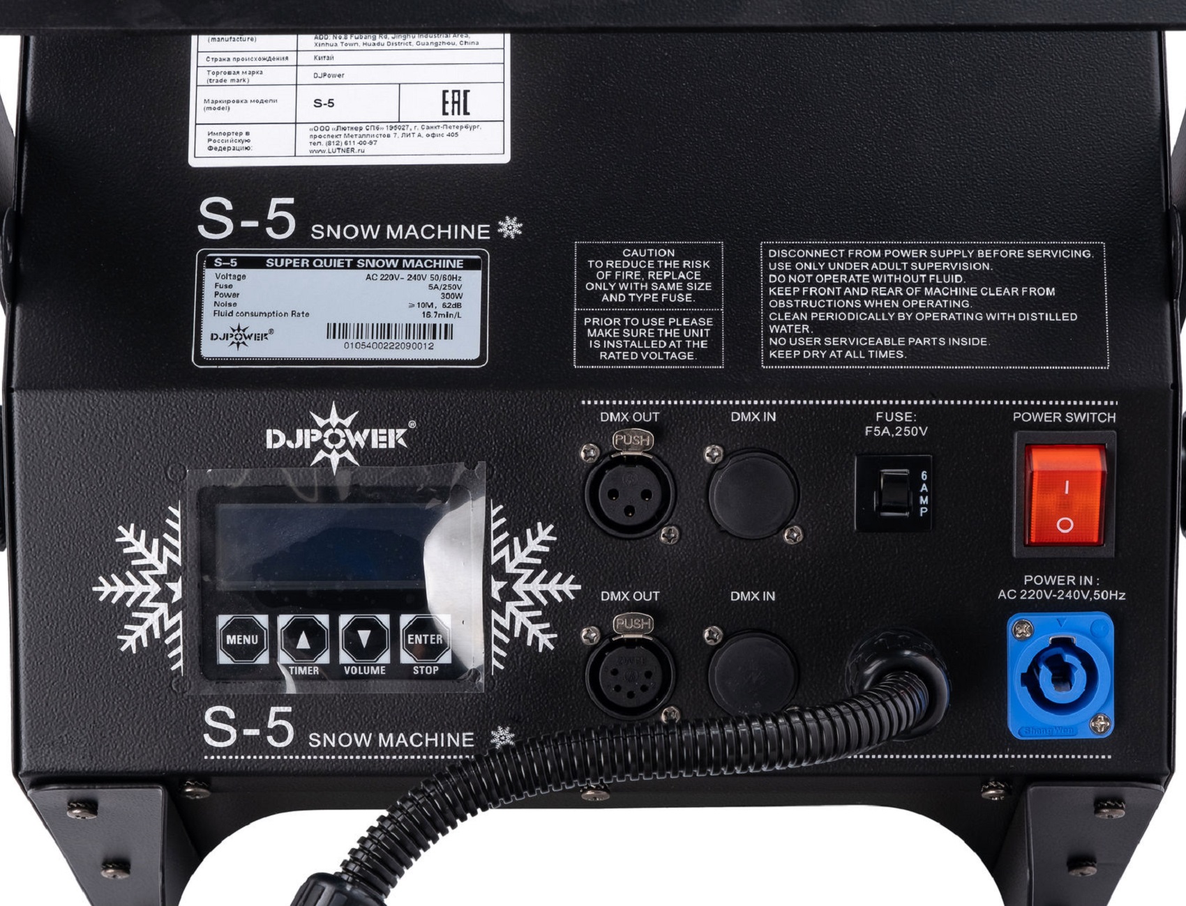 S-5 – профессиональный генератор искусственного снега. Он может создавать как тихий романтический снег, так и удивительные эффекты метели, при этом у него очень низкий уровень рабочего шума, что делает S-5 отличным прибором для ситуаций, где требуется тихая работа. Точная настройка объема выхода и скорости вентилятора позволяют достичь идеального визуального эффекта.