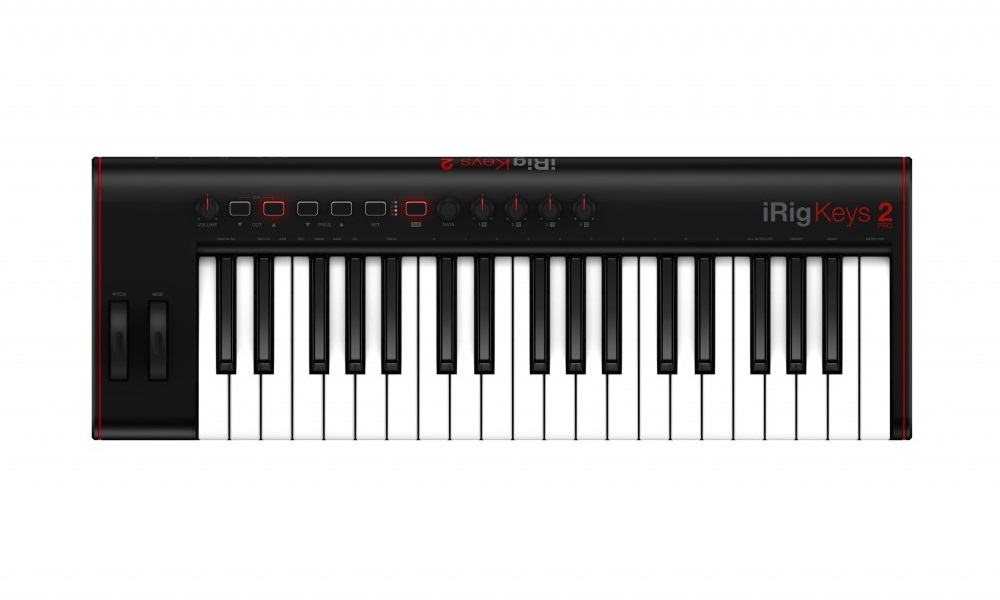 Разнообразие органов управления в iRig Keys 2 велико: здесь и колеса модуляции, и питч бенд, а также выходная громкость, клавиши переключения октав и программ, кнопка установки, кнопка ALT и энкодер данных.