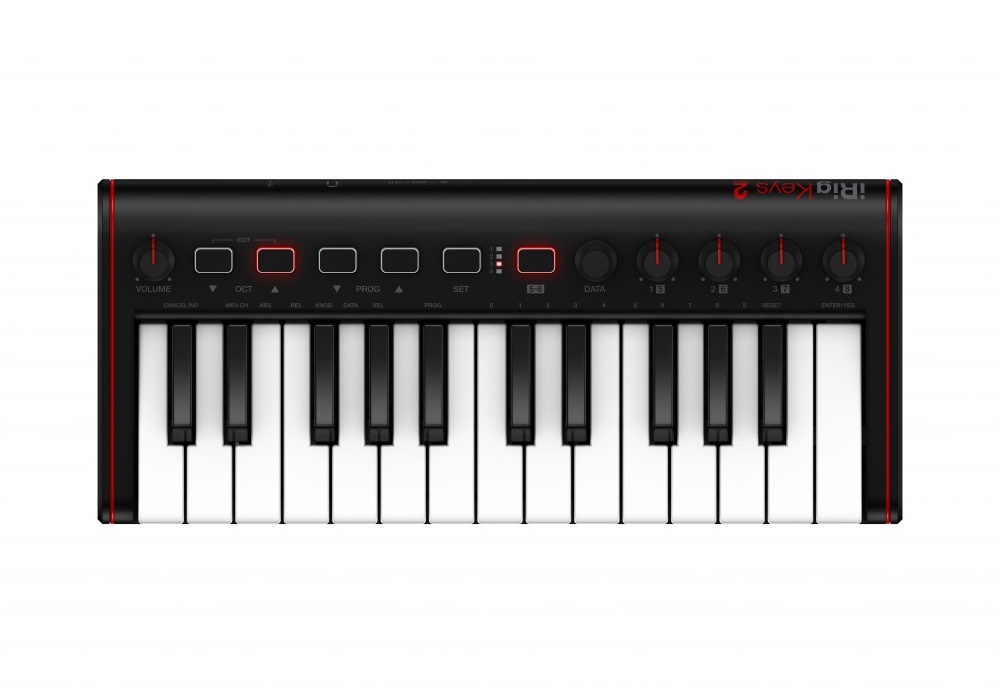 Разнообразие органов управления в iRig Keys 2 велико: выходная громкость, клавиши переключения октав и программ, кнопка установки и энкодер данных.