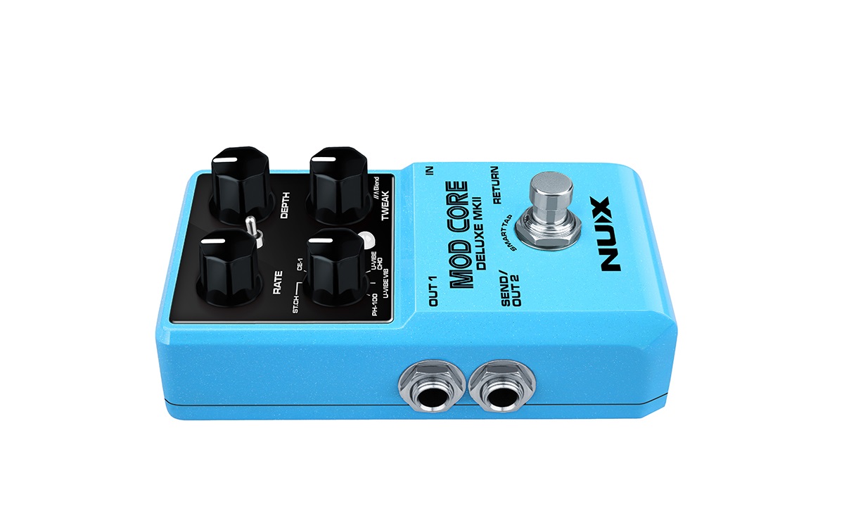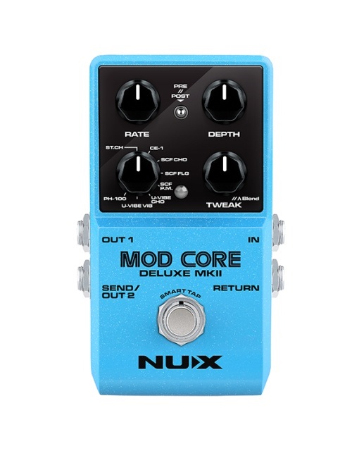 Nux Mod Core Deluxe MkII — это педаль с 8 различными типами модуляции, включая ST.CH (Stereo Chorus), CE-1, SCF CHO, SCF FLG, SCF PM, U-VIBE CHO, U-VIBE VIB и PH-100. Вы можете переключать типы модуляции с помощью поворотного переключателя Type.