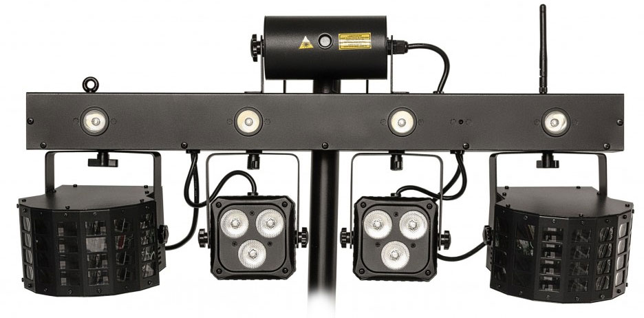 Мобильная, светодиодная световая установка состоящая из 5 световых LED-приборов, установленных на перекладине, включая транспортировочный кейс, ИК-пульт ДУ и ножной беспроводной контроллер.