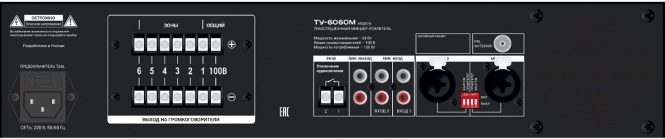 «Выходная группа»: Линейный выход (разъем типа RCA). Шесть групп (зон) для подключения акустических систем в режиме 100 В. Разъемы выполнены на контактах «под винт».