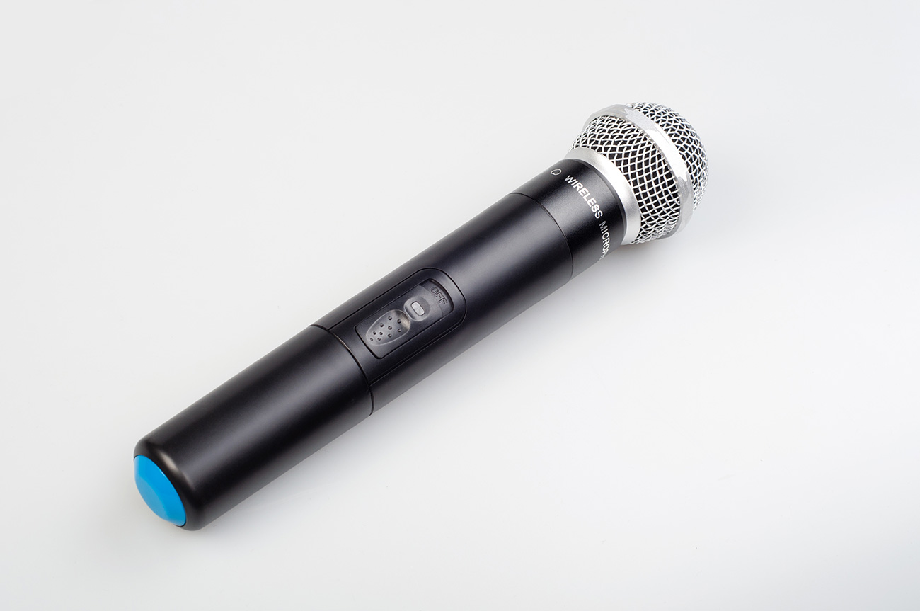 В комплекте ручной микрофон и беспроводной головной микрофон.