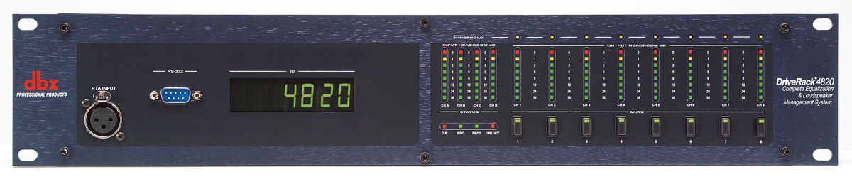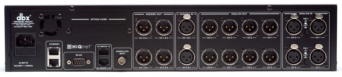 dbx DriveRack спикер-процессор 2 аналоговых входа XLR, 2 цифровых AES входа, 8 аналоговых вых. XLR, 8 цифровых AES вых., WordClock вход, RTA-Mic XLR вход. Высота 2U. Управление по сети HiQnet (ПО System Architect), порт для подключения настенных панелей ZC